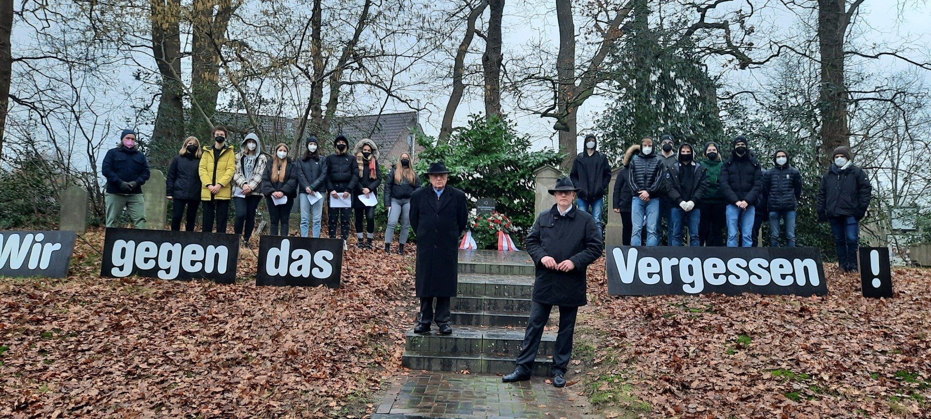 Am 27. Januar 1945 wurde das Konzentrationslager Auschwitz befreit und jedes Jahr an diesem Tag wird auch in Wildeshausen dem schrecklichen Holocaust gedacht, bei dem 6 Millionen Jüdinnen und Juden auf grausamste Art und Weise ihr Leben verloren. Auf dem jüdischen Friedhof in Wildeshausen trafen sich zum gemeinsamen Gedenken Vertreter des Jüdischen Landesverbandes sowie aller weiterführenden Schulen der Stadt Wildeshausen und Vertreterinnen und Vertreter der Stadt Wildeshausen. Dazu wurden Kränze niedergelegt und mahnende Worte durch die Redner gesprochen. Zwei Schüler aus der Klasse 9e verlasen hierzu die Namen der getöteten jüdischen Einwohnerinnen und Einwohner Wildeshausens.