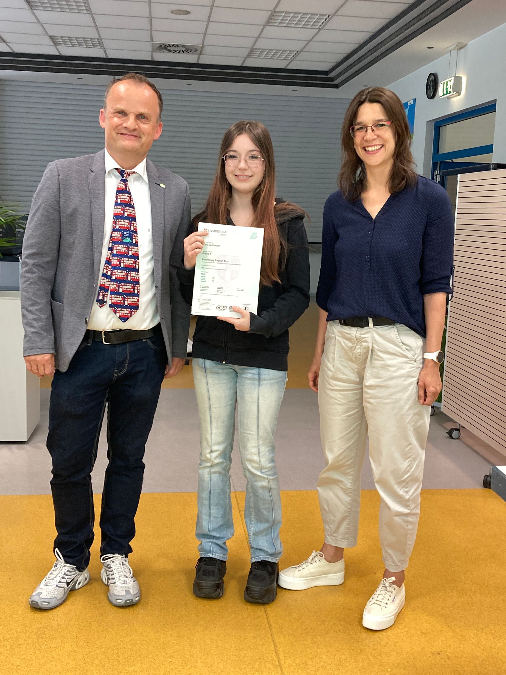 Alle beteiligten Personen freuen sich über die positiven Ergebnisse! 12 der 16 Schülerinnen und Schüler haben mit Auszeichnung bestanden, davon 5 „pass with distinction“, der höchsten Auszeichnungsstufe, die Cambridge vergibt, und 7 „pass with merit“. Insgesamt ein wirklich herausragendes Ergebnis! Die Zertifikate wurden im Rahmen einer kleinen Feierstunde am 04. Juni 2025 an die Teilnehmerinnen und Teilnehmer verliehen.