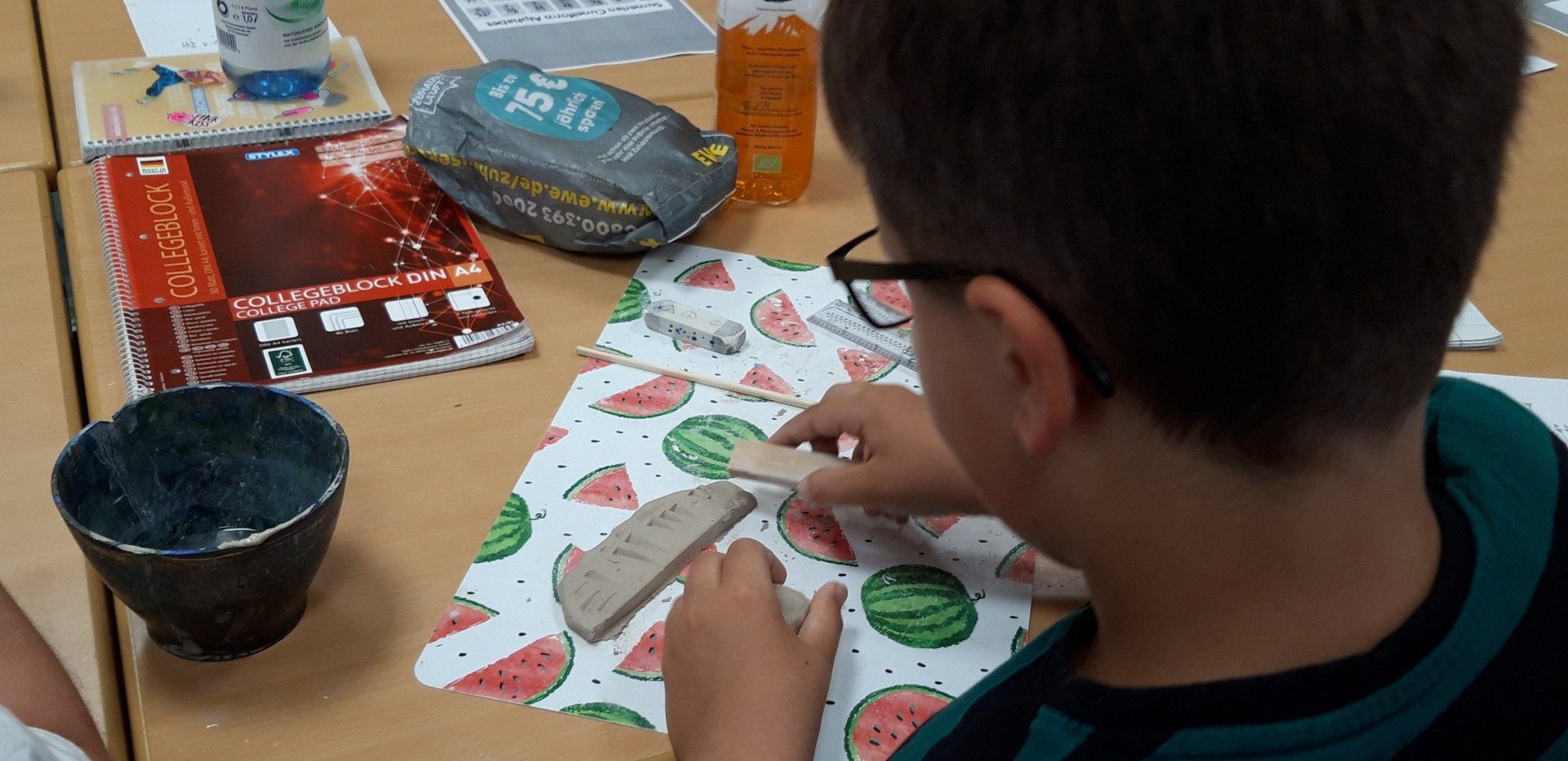 Anhand des Modells eines typischen Einraumhauses haben wir uns mit den Veränderungen der Lebensweise von der Alt- zur Jungsteinzeit beschäftigt. Durch die Sesshaftigkeit mit dem Ackerbau und der Viehzucht konnten mehr Menschen versorgt werden und es wurden Vorräte angelegt. Dafür waren getöpferte Gefäße erforderlich. Mit Hilfe der Wulsttechnik haben wir kleine Trinkgefäße hergestellt.