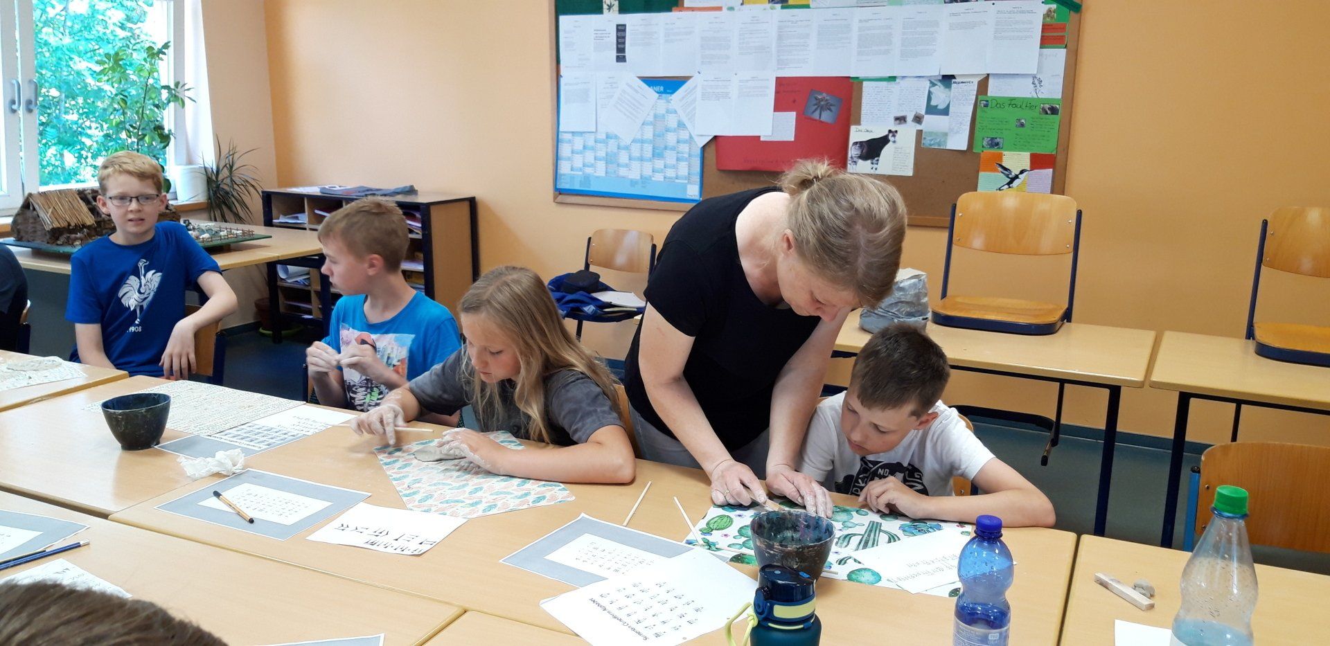 Als eine sehr bedeutende Entwicklung dieser Zeit haben wir uns mit der Schrift beschäftigt: die Keilschrift. Auf kleine Tontäfelchen haben wir mit einem Holzgriffel das Schreiben wie zur damaligen Zeit geübt. Auch wenn es zunächst schwierig aussah, haben es alle Schülerinnen und Schüler geschafft, ihren Namen in Keilschrift auf den Täfelchen zu verewigen.