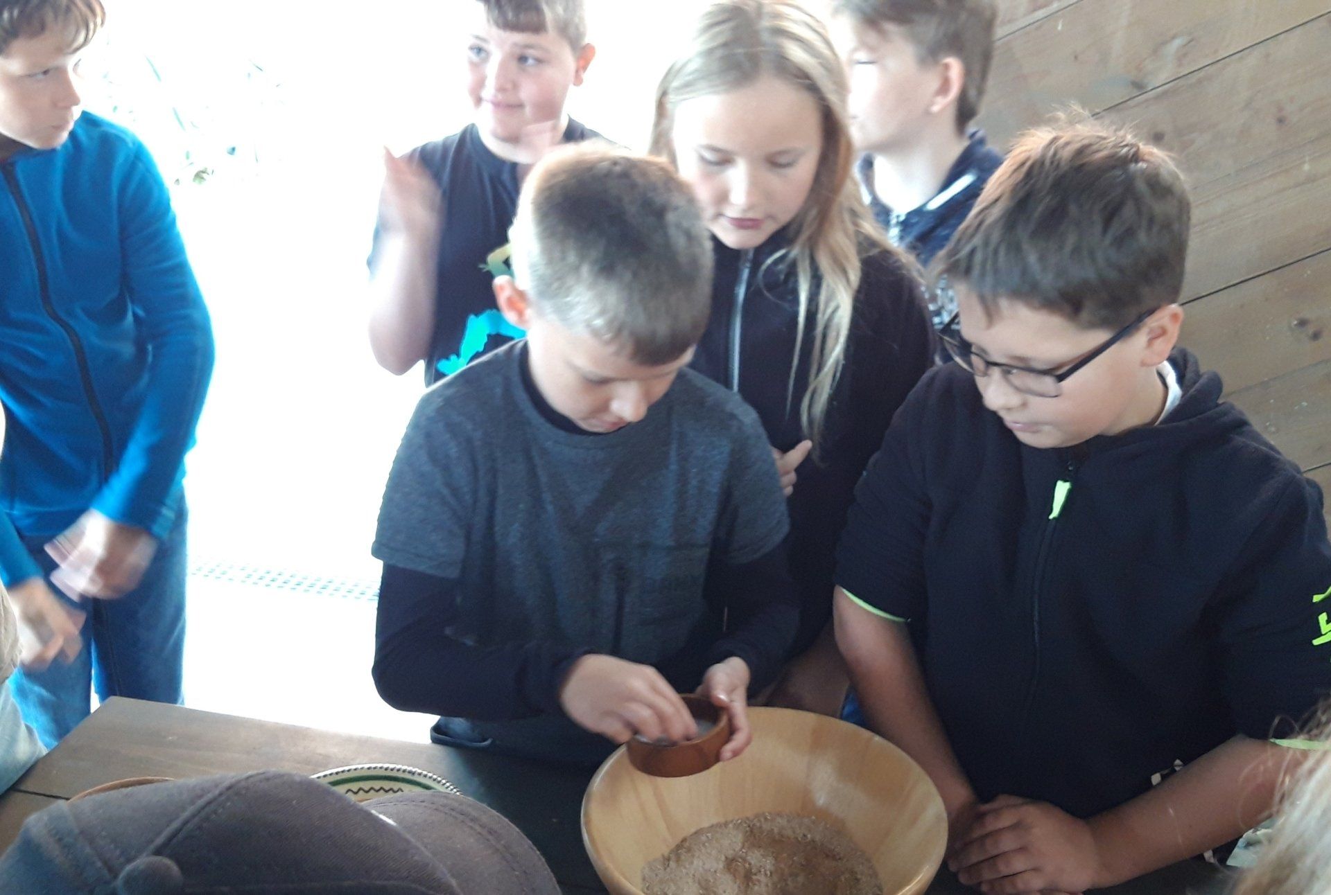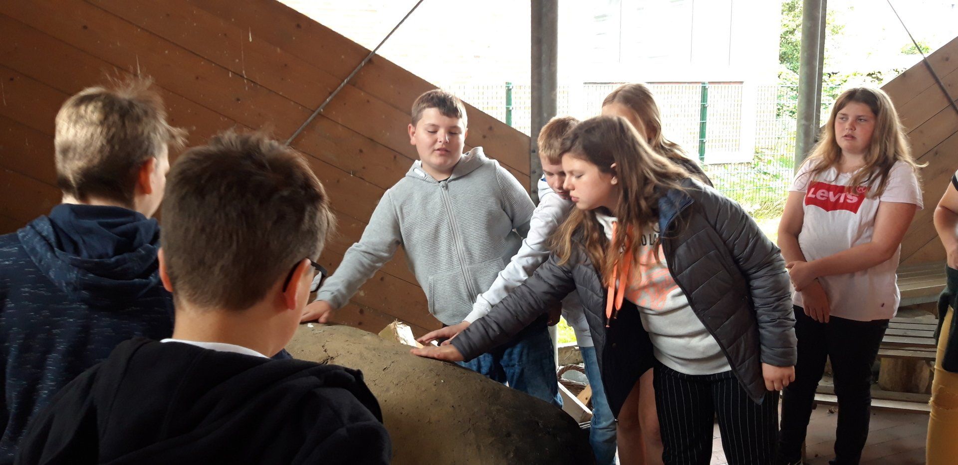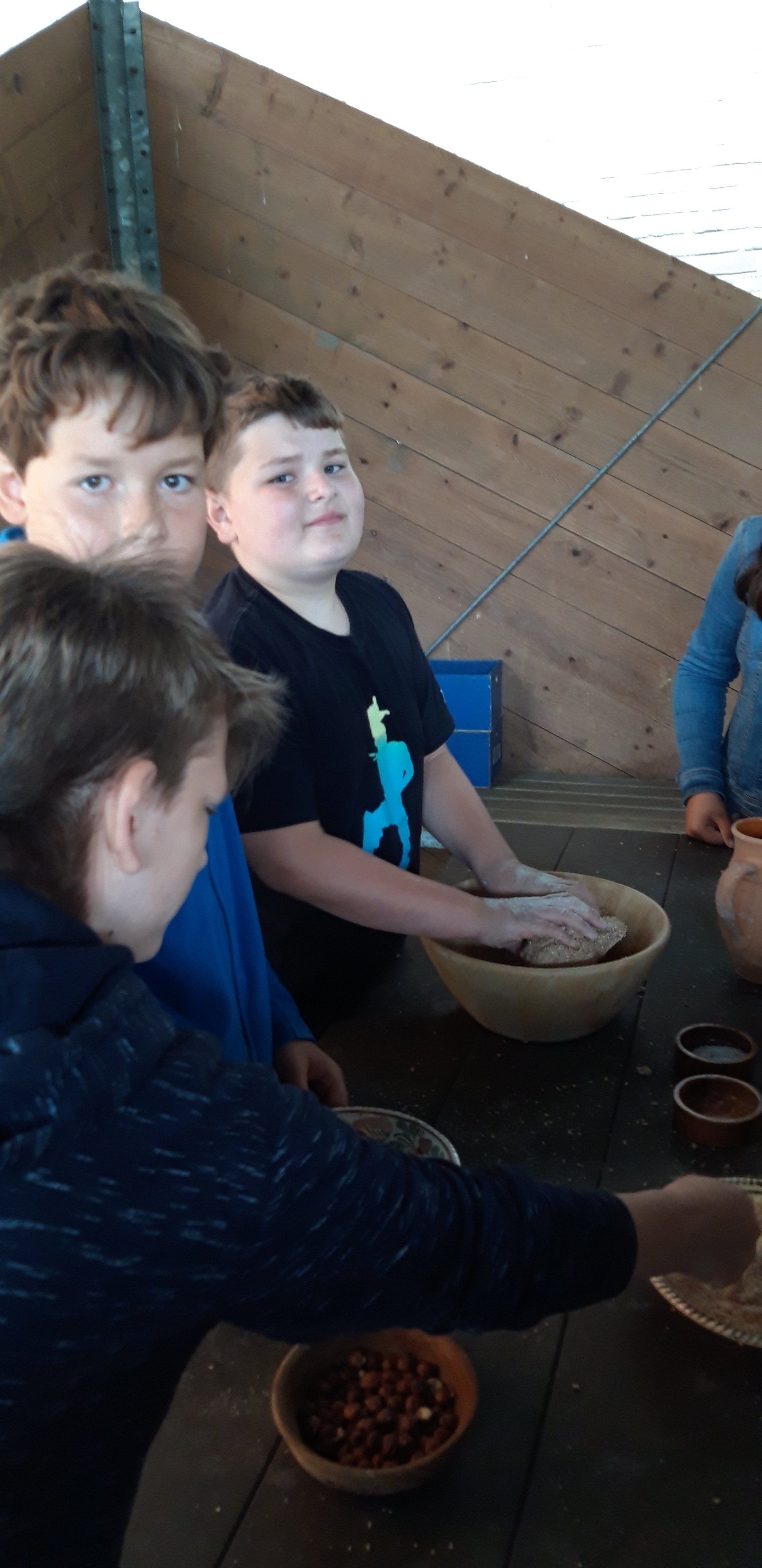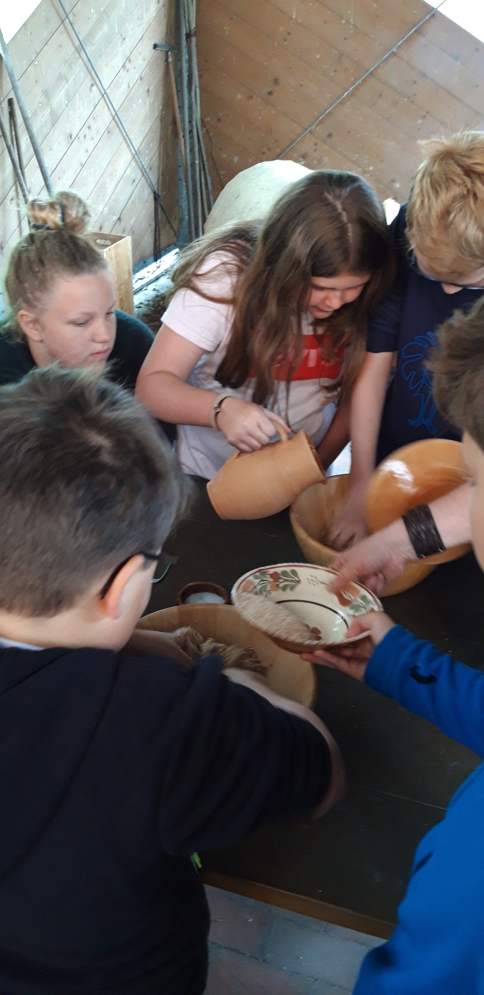 Anhand des Modells eines typischen Einraumhauses haben wir uns mit den Veränderungen der Lebensweise von der Alt- zur Jungsteinzeit beschäftigt. Durch die Sesshaftigkeit mit dem Ackerbau und der Viehzucht konnten mehr Menschen versorgt werden und es wurden Vorräte angelegt. Dafür waren getöpferte Gefäße erforderlich. Mit Hilfe der Wulsttechnik haben wir kleine Trinkgefäße hergestellt.