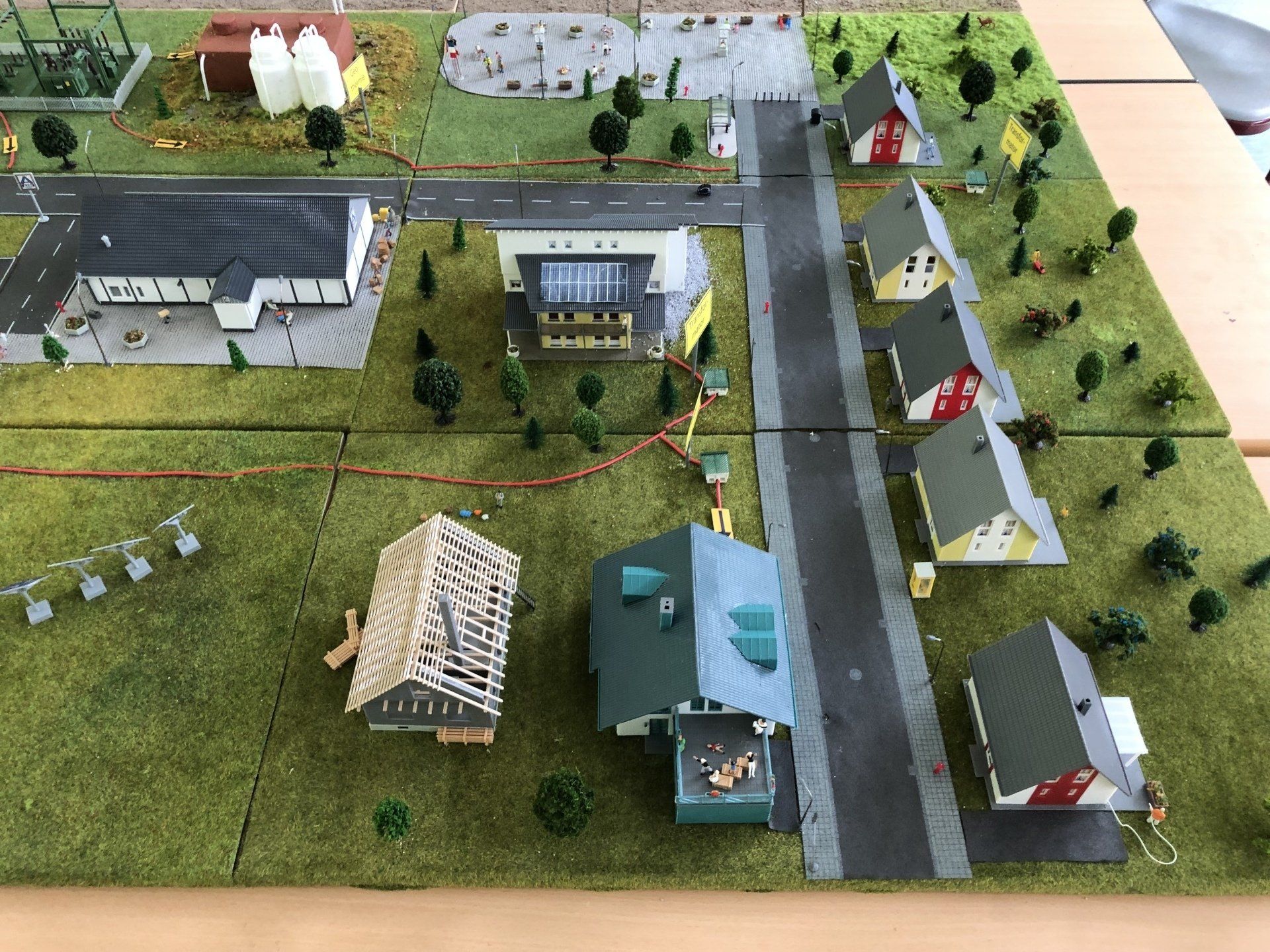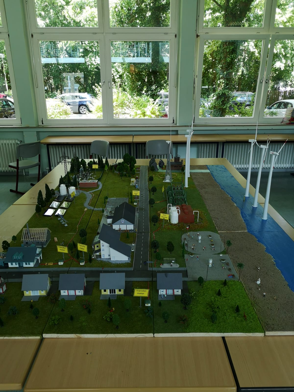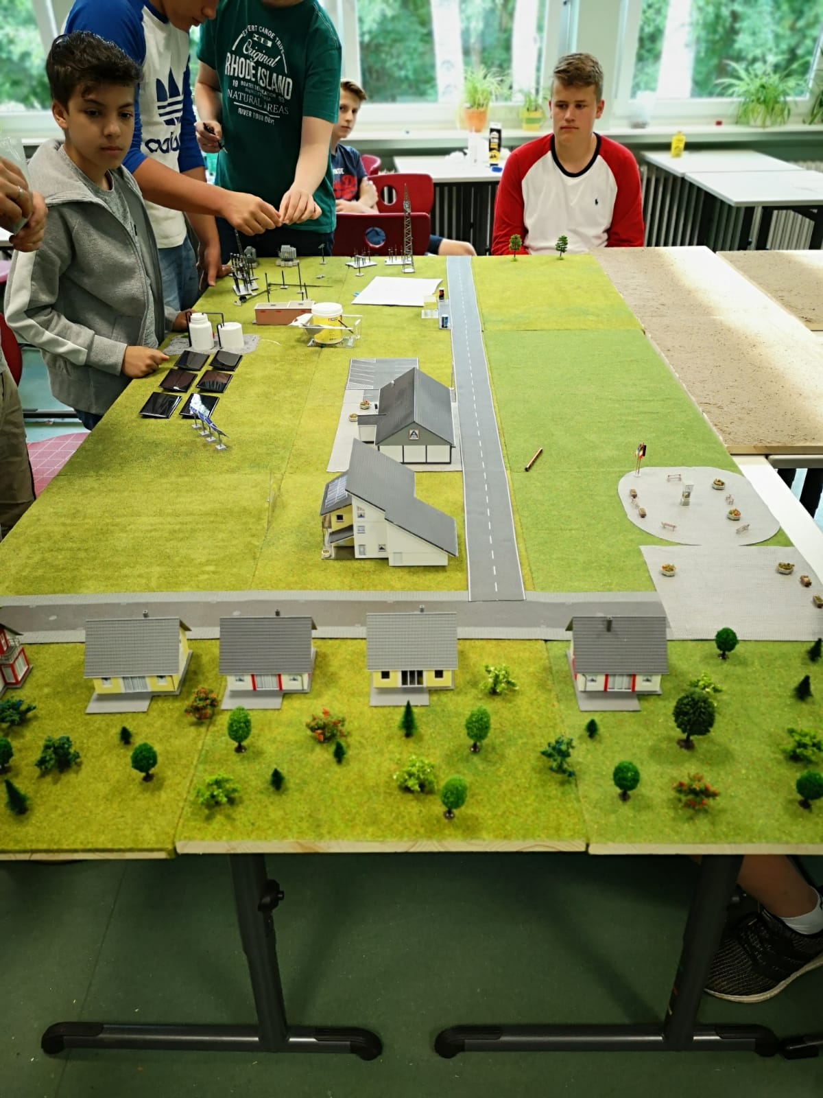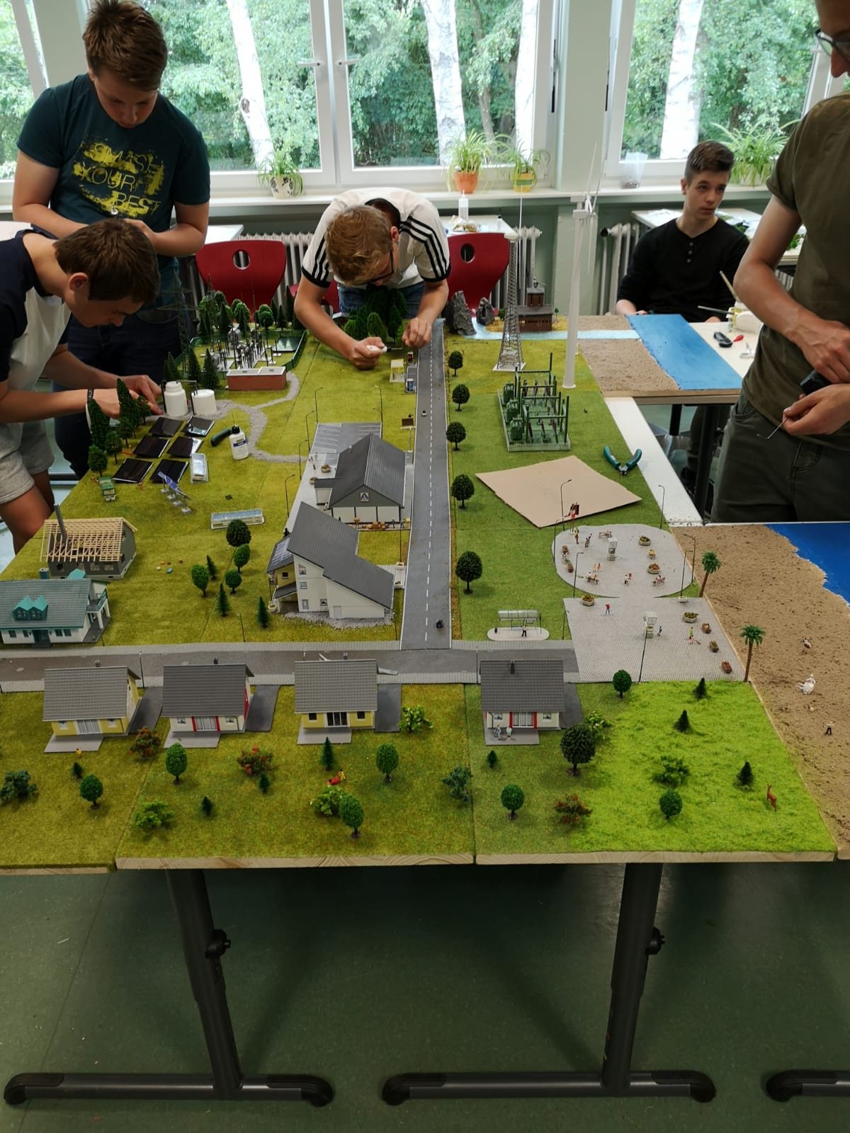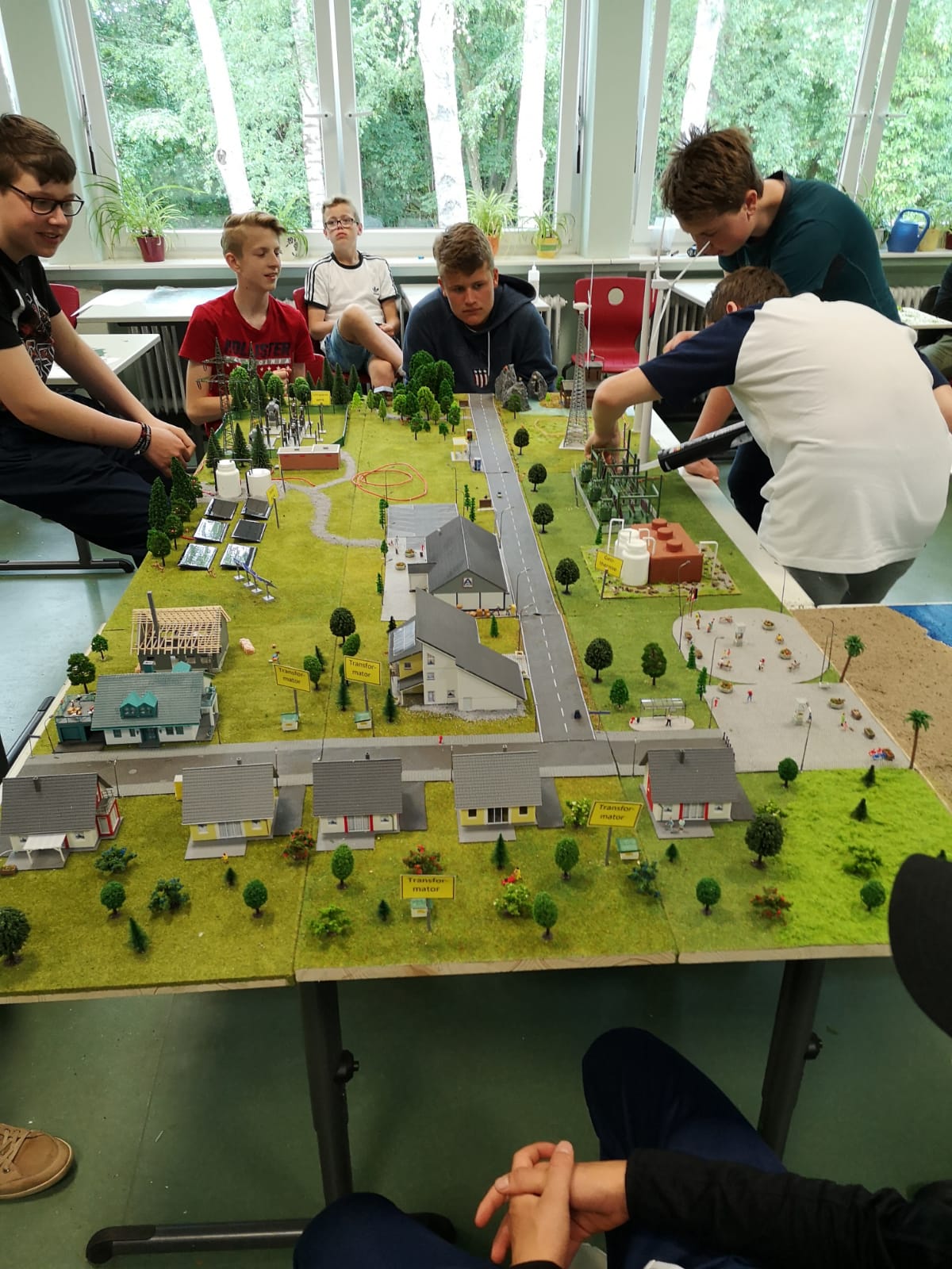 Innerhalb des Projekts 17 haben sich die Schülerinnen und Schüler mit dem Weg des Stroms auseinandergesetzt. Was sich erst einmal langweilig anhört, wurde schon nach kurzer Zeit spannend! Nach einer theoretischen Einführung in unterschiedlichen Gruppen haben die Schülerinnen und Schüler eine kleine Miniaturwelt gebaut, welche später auf dem Sommerfest ausgestellt wurde. Hierzu haben sie Windkraftanlagen, Biogasanlagen, Wasserkraftwerke, Solarkraftwerke, Häuser, Märkte, Straßen, Wälder usw. geplant und gebaut. In unterschiedlichen Teams haben wir uns gegenseitig unterstützt und unter der Leitung von Herrn Sommerfeld und Herrn Wessel ein tolles Ergebnis erzielt. Anfangs war noch keinem so richtig klar, was am Ende herauskommt, aber seht doch selbst und schaut euch das Ergebnis und unseren Weg an. Viel Spaß!